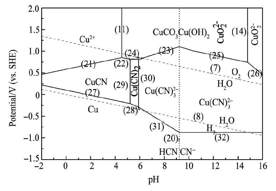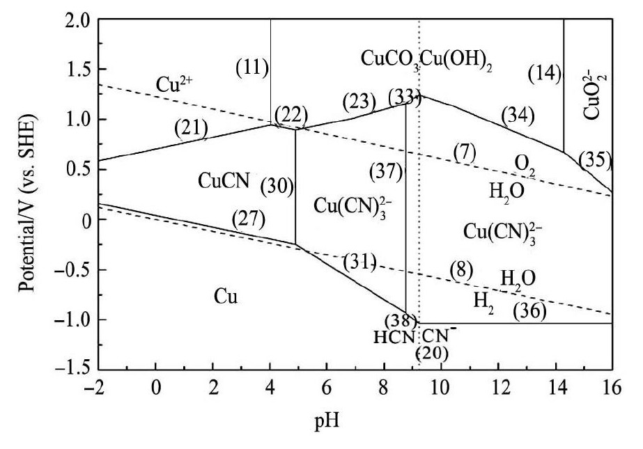 2.2CuCO3Cu(OH)2-CN-H2O体系的E-pH图