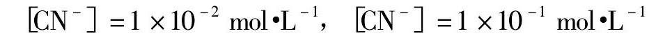 从图3知,当氰化物 组分浓度 由1 × 10- 2mol·L- 1提高到1 × 10- 1mol·L- 1时,孔雀石主要生成高配位数的铜氰络合物,Cu( CN)2稳定区域消失,同时在p H > 8. 76条件下铜会以配合物Cu ( CN)34形式存在,这表明氰根浓度的增大有利于高配位数铜氰络合物的形成。