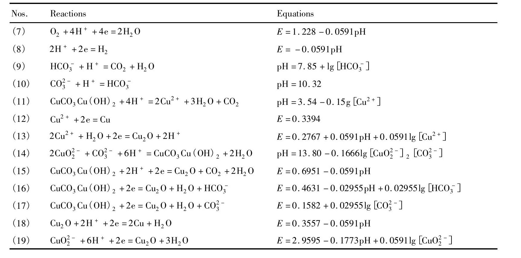 表3 Cu CO3Cu( OH)2-H2O 体系的反应式与 E-p H 平衡式( 298. 15 K) Table 3 Equilibrium reactions and E-p H equations of Cu CO3Cu( OH)2-H2O system at 298. 15 K