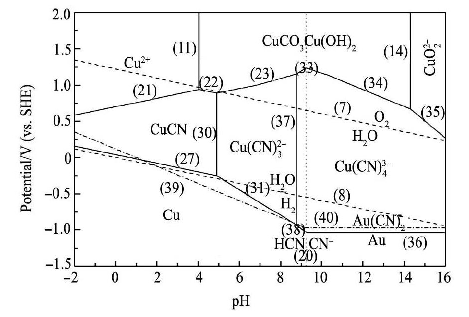 通过计算得到Cu CO3Cu( OH)2-Au-CN-H2O体系的E-p H平衡式见表4,绘制Cu CO3Cu ( OH )2Au-CN-H2O体系E-p H图,见图4。