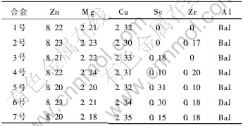 以工业纯铝(99.85%)、 纯铜(99.99%)、 纯锌(99.92%)、 纯镁(99.90%)以及Al-2.3%Sc和Al-3%Zr中间合金为原料。 合金的化学成分在LEEMAN SPEC-E型电感耦合等离子体原子发射光谱仪上进行测试, 结果如表1所示。