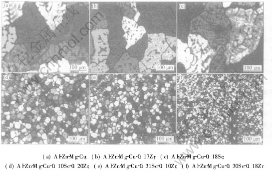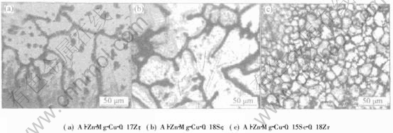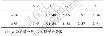 Sc和Zr添加的基本原则是要确保在非平衡结晶及特定的铸造条件下, 大部分Sc和Zr仍保留在过饱和固溶体中, 少量的Sc和Zr在结晶时以Al3Sc, Al3Zr和Al3(ScZr)质点析出, 析出的难溶质点对铸锭晶粒组织起细化作用, 固溶的Sc和Zr在随后的热处理及加工工艺条件下析出弥散的铝化物次生质点, 抑制再结晶, 对合金起强化作用。