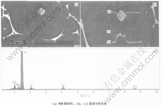 图 3 Al-Zn-Mg-Cu-0.30Sc-0.18Zr合金SEM微组织和能谱分析结果