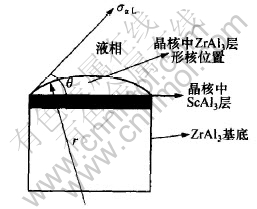由式(1)和(2)可知, 临界形核半径与过冷度成反比, 与晶核同铝熔体之间的表面张力成正比; 临界形核功与临界形核半径的平方成正比, 与晶核同熔体之间的表面张力成正比。 非均质形核所需的形核功很小, 形核的关键主要取决于难溶质点“基底”, θ角越小, 形核率越高; 2个相互接触的晶面结构越近似, 原子间距越相当, 就越能促进晶核的形成。 Al3Sc, Al3Zr, Al3(ScZr)与α(Al)点阵结构极其相似, 对形核能起催化作用。