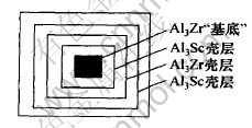 Al3(ScZr)粒子的形核过程为: Al3Zr优先形核(形核基底), Al3Sc堆砌在Al3Zr表面, Al3Sc外层为Al3Zr, 再外层为Al3Sc, 以此类推, 形成多重复合结构的Al3(ScZr)。 Al3(ScZr)形核模式如图6所示, 其形核机制是: Al3(ScZr)通过Al3Zr形核, α(Al)通过Al3(ScZr)形核。