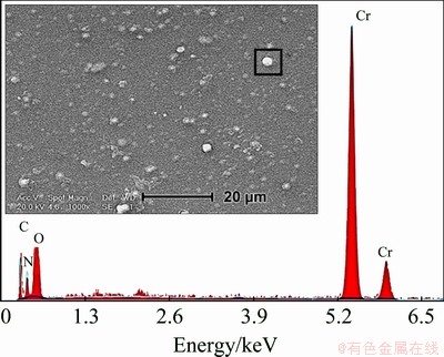 Fig. 4 SEM micrograph of DLC coating surface showing the presence of white particles and corresponding EDS analysis