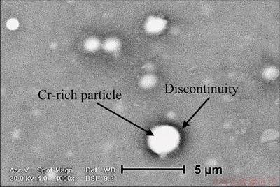 As mentioned above, before the final DLC coating deposition, chromium and chromium carbide thin layers were applied on the surface as intermediate layers. These white regions probably correspond to the intermediate layers where the final DLC coating did not properly cover the surface. The microstructure of deposited coating at chromium-rich areas is depicted in Fig. 5 by SEM observations at a high magnification. As can be observed, the discontinuity regions are visible just around the Cr-rich particles. The different chemical affinity or adhesion strength of the DLC coating to either Cr-rich particles or the DLC coating itself may cause such discontinuities and coating defects [34].