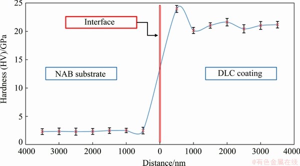 Fig. 6 Nano-hardness variation across cross-section of DLC-coated sample