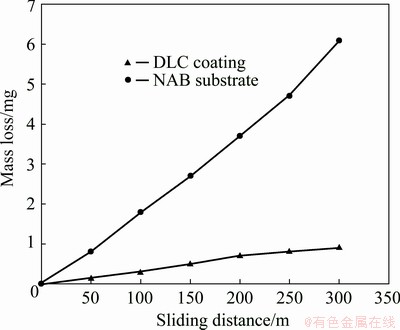 Fig. 7 Mass loss of NAB substrate and DLC coating as function of sliding distance