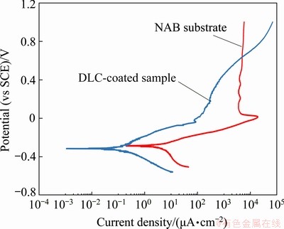 Fig. 9 Polarization behavior of bare NAB substrate and DLC-coated sample in 3.5 wt.% NaCl solution