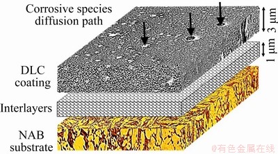 According to Fig. 9 and Table 2, the DLC coating increases the polarization resistance from 10.7 kΩ·cm2 for bare NAB substrate to 193.8 kΩ·cm2 for DLC-coated sample. The lower corrosion resistance in addition to the higher corrosion current density of bare NAB substrate (Jcorr=2.5 μA/cm2) is detectable in comparison with DLC-coated sample with corrosion current density of 0.14 μA/cm2. Furthermore, the cathodic Tafel slope for the NAB substrate polarization curve, i.e., -0.27 V/dec, is higher than that of DLC-coated sample, i.e., -0.12 V/dec. The higher cathodic Tafel slope of NAB substrate is mainly due to the fast cathodic reduction kinetics. It seems that DLC coating acts as a barrier layer against corrosion because of low porosity and proper adhesion of DLC coating to the substrate. The coating prevents corrosive species such as chloride ions and oxygen molecules from reaching the substrate surface and as a result, the corrosion rate will be decreased. The protective efficiency and total coating porosity of DLC coating on NAB substrate in 3.5 wt.% NaCl solution calculated from corrosion current density were 94.4% and 0.04, respectively. This result corroborates with another research by MANHABOSCO and MüLLER [42], wherein the DLC coating fabricated on Ti6Al4V alloy possesses a protective efficiency of about 97% and a porosity of 0.01. It should be emphasized that the coating porosity, even to a low extent, is responsible for diffusion of corrosive species through the coating and subsequent local corrosion, coating blistering, and delamination. A schematic illustration of corrosion system for DLC-coated NAB alloy is shown in Fig. 10.