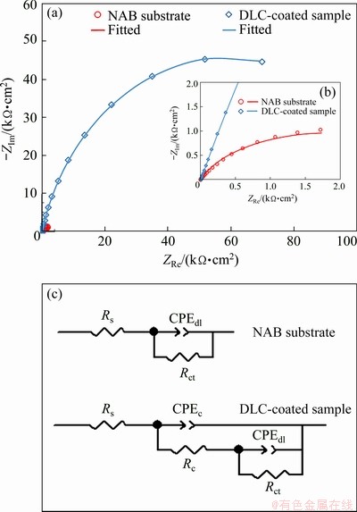 Fig. 11 Nyquist plots (a), enlarged Nyquist plots together with corresponding fitted curves for bare NAB substrate and DLC-coated sample (b), and equivalent circuit related to NAB substrate and DLC-coated sample (c)