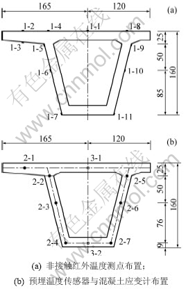 选取边箱梁距跨中1 m处截面为试验观测断面。观测断面测点布置如图1所示。采用非接触红外测温仪观测混凝土箱梁外表面温度,测点编号(1-1)~(1-11)。预制混凝土箱梁时,已预埋温度传感器和混凝土应变计,编号分别为(2-1)~(2-7)和(3-1)~(3-2)。悬臂板一侧的腹板为外腹板,反之为内腹板。
