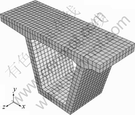 利用有限元软件建立现场试验数值模型,对拆模后混凝土箱梁水化热温度弹性应变及水化热温度徐变应变进行数值模拟分析。基于弹性徐变理论方程隐式解法,编写子程序定义混凝土材料本构关系,采用初应变增量有限元法进行数值计算。模型中未考虑箱梁内部钢材的影响。通常认为桥梁沿桥跨方向温度相同,所以箱梁模型长度取1 m。混凝土箱梁有限元模型如图2所示。