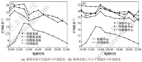拆模后混凝土箱梁观测断面各部位平均温度与周围环境大气温度实测数据对比如图3所示。