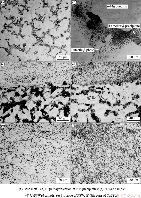 Figure 5 illustrates the optical micrographs of the BM and different welding areas of AZ91 magnesium alloy obtained at 1400 r/min and 40 mm/min. As shown in Fig. 5(a) and Fig. 5(b), the BM has coarse grain α-Mg matrix surrounded with β-Mg17Al12 dendrite or β+α phases. Similar microstructure for as-cast magnesium AZ91 alloy was reported in other works [43-45]. The backscattered scanning electron (BSE) micrographs (Figs. 6(a, b)) of base metal confirm the optical micrographs results. The EDX point analysis results of Fig. 6 are summarized in Table 3. The dark areas in the BM are mainly α-Mg grains and the amount of Al is determined to be (3.3±0.1) wt.% which is higher than the equilibrium maximum solid solubility of Al (1.5 wt.%) in Mg at room temperature [46]. It has been shown that Al slightly supersaturates in α-Mg. The gray dendritic areas are determined as β-Mg17 Al 12 which include Zn solute atoms. It has been reported that in Mg-Al-Zn alloys, Zn mainly substitutes Al and forms a new intermetalic Mg17 Zn12 phase [47,48]. For FSW and UaFSW specimens, α-Mg matrix presents an increase in Al content. The average content of Al in FSW and UaFSW is obtained by sampling four testing point which is equal to 6.4 and 7.7 wt.%, respectively, which is much higher than the Al content for BM. Therefore, it is inferred that the particles of β-phase have been resolved again in α-Mg during FSW and UaFSW.