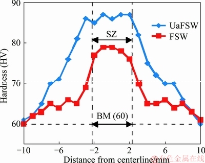 Fig. 7 Hardness profiles of UaFSW and FSW joints