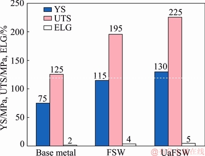 Fig. 8 Comparison of yield stress (YS), ultimate strength (UTS) and elongation (ELG) for BM, FSW and UaFSW joints