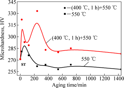 图1所示为TNTZF合金经过(900 ℃,1 h)固溶处理(ST)后,经过550 ℃单级和(400 ℃,1 h)+550 ℃双级时效的时效硬化曲线。从图1中可以看出合金固溶处理后的显微硬度约为270 HV。合金经过单级550 ℃等温时效后,硬度曲线先升高后降低至一个稳定的平台,时效1 h后硬度达到峰值为293 HV,4 h后硬度值稳定在258 HV左右。合金双级时效硬化曲线整体处于单级时效的上方,呈现出明显的双峰形状,最后随第二阶段时效时间延长,硬度趋至稳定。双级时效制度下合金表现出较敏感和较高的时效硬化响应。双级时效对应的两个峰时效时间和硬度分别是(20 min,321 HV)和(4 h,332 HV),8 h之后硬度值稳定在278 HV左右。
