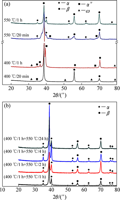 图2所示为TNTZF合金经过单级和双级时效后的XRD谱。前期工作表明固溶态TNTZF合金由亚稳β和少量的马氏体α″组成[14]。从图2(a)单级等温时效的XRD谱中可以看出,400 ℃单级时效20 min后,合金组织由β相、ω相和少量马氏体α″组成。随着时效时间延长至1 h,α″相的衍射峰强度明显升高,伴随β相发生马氏体转变、ω相向α″马氏体和α转变,使得α″数量增多,另外ω相弥散分布为α相析出提供均匀形核的条件。在550 ℃单级时效20 min后,合金主要由α、β相组成且存在少量的马氏体α″,随时效时间延长,马氏体α″向α相转变,时效1 h后马氏体α″完全分解消失,合金达到α+β两相平衡。在400 ℃较低温度时效时,随时效时间延长,合金中发生ω→α″→α或ω→α转变。在550 ℃单级时效情况下,由于温度较高,原子扩散速率加快,ω相或马氏体α″的存在时间比较短,α相转变加快,短时间达到了α+β两相平衡状态;一般而言,时效温度越高,α相析出的动力学阻力就越小,因此合金中单个晶粒析出α相的体积就会越大[15]。