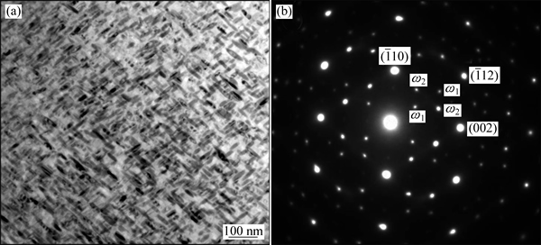 从图2(a)的XRD谱中可看出合金中存在ω相,为了进一步证明其存在性,对其进行电子衍射花样表征。图3所示为合金400 ℃、20 min单级时效的TEM像及选区电子衍射花样。从图3(a)中可以看出400 ℃、20 min单级时效后,合金中出现椭球状的ω相,尺寸达到50 nm左右。椭球状ω相呈现出两种不同的位向,两种位向的角度接近120°,从其相对应的衍射花样图3(b)也可证实这一点。该结果与XRD分析结果相吻合。