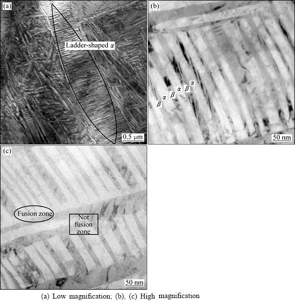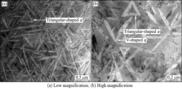 图4所示为550 ℃单级时效4 h后的α相TEM明场像。图4(a)所示基体中α相均匀分布在β基体中,呈针状特征,长度约为0.3~0.8 μm,有的相互连接成V形或三角形(图4(b))。(400 ℃/1 h+550 ℃)双级时效4 h后的α相TEM明场像见图5。从图5中观察到一种不同于单级时效时的α相形貌,称之为阶梯状α相。与西安交通大学陈威等[21]通过对Ti1023合金进行预应变的研究结果相似。陈威等认为这种α/β相间的片层组织是由应变诱发产生的马氏体α″在高温时效阶段分解产生。通过阶梯状α相的放大照片(见图5(b),(c)),可以清楚地看到其内部有很多扁条状的α相相互平行沿同一个方向聚集生长,构成一个大的α相簇,其尺寸相比其他形貌大很多,超过5 μm并贯穿整个观察视野。这种阶梯状的α相在其他双级时效样品中均存在,且随第二阶段时效时间的延长,其尺寸增大。根据前面XRD的分析结果,认为在双级时效的第一阶段400 ℃低温时效时ω开始分解,转变成马氏体α″,α″沿着某一个位向平行生长,并随着第二阶段时效温度升高,马氏体α″向α相转变,随保温时间延长α相开始长大;或者马氏体α″一开始就依附在比较大的α相上,马氏体α″向α相转变并平行生长的同时,α相也跟着长大。所以,在图5(c)所示中看到的阶梯状α相簇,有的已经长大融合在一起,而有的并没有融合在一起。如图1所示,双级时效的硬度曲线整体在单级时效的上面,但是从图2(b)所示相组成来说单级和双级时效一定时间后,都达到β+α的平衡状态。从双级时效的TEM明像场可以看出,阶梯状的α相很明显,数量比较多,所以阶梯状的α相对硬度增加起到明显的作用。这种超大的阶梯α相,在整个合金内相当于一个骨架的作用,所以双级时效的合金显微硬度要比单级时效的要高。