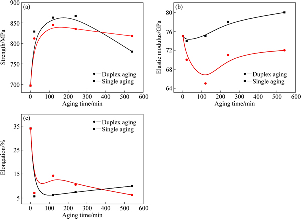 Fig. 6 Relationship between aging time and ultimate strength (a), elastic modulus (b) and elongation (c) of TNTZF alloy after 550 ℃ single aging and ((400 ℃, 1 h)+550 ℃) duplex aging
