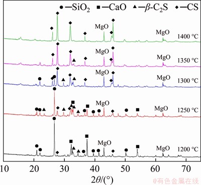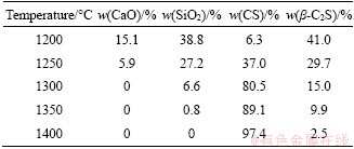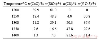 According to Ref. [15], both CS and β-C2S can form when the C/S molar ratio is 1.0. The XRD spectra of CaCO3 and SiO2 mixture heated to different temperatures without duration are shown in Figure 1, and the corresponding phase compositions calculated from the XRD data are presented in Table 1. The phases mainly include CaO, SiO2, CS and β-C2S. The CS (PDF card 31-0300#) belongs to a cyclic calcium silicate with P-1(2) space groups, and the crystallographic parameters are as follows: a=b=0.6820 nm,c=1.9650 nm, α=β=90.4°, γ=119.3°. The β-C2S (PDF card 33-0302#) belongs to larnite with P21/n(14) space groups, and the crystallographic parameters are as follows: a=0.9310 nm, b=0.6756 nm, c=0.5506 nm, α=γ=90.0°, β=94.46°.