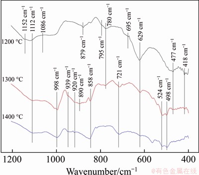 The FT-IR spectra of samples heated to different temperatures without duration are shown in Figure 3. The main absorption peaks when heated to 1200 °C are centered at 1152, 1112, 1086, 879, 780, 695, 629 and 477 cm-1. By comparing the infrared spectra of quartz, C2S and CS [16], it can be seen that most of the characteristic peaks correspond to quartz. However, the absorption peaks at 879 and 418 cm-1 were conformed to the typical characteristic peaks of β-C2S, which belong to the asymmetric expansion vibration and the bending vibration of O-Si-O bonds in C2S, respectively. It indicates that a low-symmetry island structure of isolated Si-O tetrahedron initially forms at 1200 °C. When the heating temperature rises to 1300 °C, SiO2 only has the characteristic peaks at 1112 and 780 cm-1, but the corresponding peak intensities decline significantly. Besides the absorption peaks at 879 and 418 cm-1, the characteristic peaks of β-C2S also appear at 998, 890, 858, 629 and 477 cm-1, indicating that the island structure of C2S forms at 1300 °C. Meanwhile, new absorption peaks at 939, 920, 721, 565 and 498 cm-1 exist, which were assigned to the characteristic peaks of high-temperature wollastonite (α-CS). The absorption peak at 721 cm-1 is the typical peak of α-CS with a ternary ring structure. When the heating temperature rises to 1400 oC, most of the characteristic peaks of β-C2S disappear, and only the absorption peaks at 998, 858 and 629 cm-1 exist. The absorption peaks of α-CS are located at 1075, 985, 940, 920, 715, 560, 480 and 431 cm-1, which are consistent with the characteristic peaks of high-temperature wollastonite. As the heating temperature rises, the content of C2S increases first and then decreases,while the content of CS increases gradually, which are consistent with the XRD results.