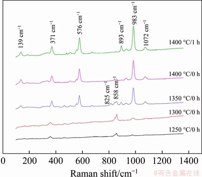 Figure 4 shows the Raman spectra of samples sintered under different conditions. The Raman spectra of CS was reported as follows [17]: the bands lower than 400 cm-1 belong to the external vibration; the bands in 400-700 cm-1 mainly correspond to the bending vibration of Si-O tetrahedron; the bands above 700 cm-1 refer to the stretching vibration of Si-O tetrahedron. The vibrational peaks centered at 139, 371, 576, 893, 983, 1072 cm-1 belong to the characteristic peaks of wollastonite, among which 371, 576 and 983 cm-1 are the typical characteristic peaks of α-CS [18]. It indicates that the crystal structure of α-CS formed at high temperature can be kept by the rapid cooling to room temperature. As the sintering temperature and holding time increase, the peak intensity of CS gradually increases, indicating that the content of CS increases gradually. It is consistent with the XRD and FT-IR results. The bands at 825 and 858 cm-1 are the characteristic peaks of β-C2S, which were appointed to the symmetric stretching vibration and asymmetric stretching vibration of Si-O tetrahedron, respectively. The intensity of β-C2S gradually enhances at 1250-1300 °C and decreases at 1300-1400 °C, indicating that the content of β-C2S increases firstly and then decreases as the sintering temperature rises. As presented in Figure 4, when the sintering temperature rises and the holding time prolongs, there is a small blue shift and broadening in the stretching vibration, bending vibration and lattice vibration, which is mainly due to the changes of bond length and bond angle caused by the deformation correction of Si-O tetrahedron around the bridging oxygen bonds [19].
