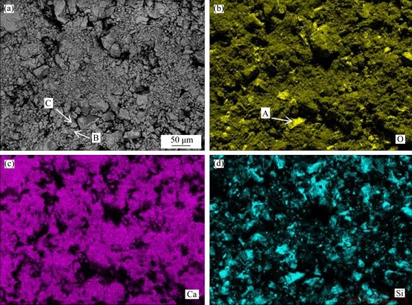 The SEM morphology of sample heated to 1250 °C without duration and its map scanning results are shown in Figure 6, and the EDS results are presented in Table 5. It is mainly composed of blocky particles and pores with different sizes (Figure 6(a)). As shown in Figures 6(b)-(d), Si element is mainly concentrated in large-size blocky particles, Ca element is evenly distributed except the large-size blocky particles, and O element is mainly concentrated on the massive particles with large grain size. The large-size blocky particles in highlight regions of Figure 6(b) (A) correspond to SiO2, and the small-size particles with a uniform distribution (B) correspond to CaO or undecomposed CaCO3. The medium-size particles (C) correspond to C2S, which are mostly distributed near the large-size particles. It can be concluded that C2S is generated by the diffusion of CaO to blocky SiO2 according to their locations.