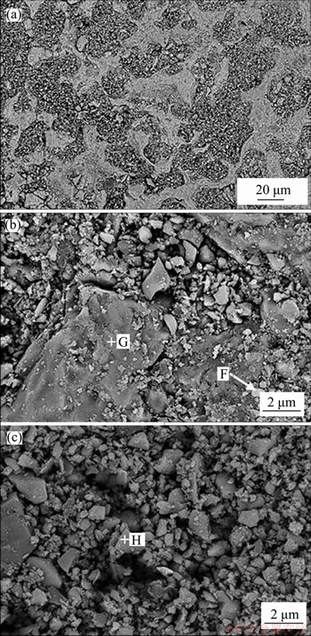 The SEM images of sample sintered at 1400 °C for 1 h are shown in Figure 8, and the EDS results are listed in Table 6. It melts partly at 1400 °C. The melting areas are distributed in grid morphology (Figure 8(b)) and the non-melting areas are distributed in dispersed particles with much smaller size (Figure 8(c)). The CaO to SiO2 molar ratios in different regions are about 1.0, indicating that the formation of CS is uniform and complete.