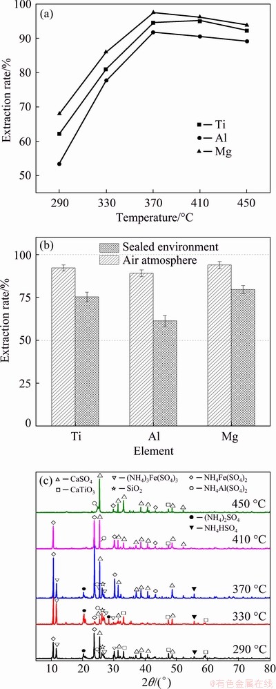 Fig. 4 Extraction rates of titanium, aluminum and magnesium (a), control experiment at different atmospheres (b) and XRD patterns of roasted slags at different temperatures (c)