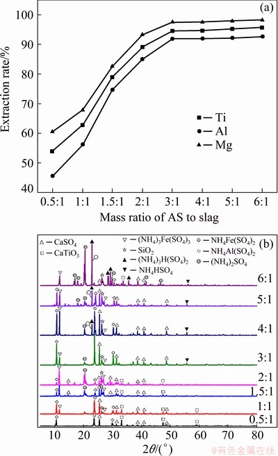 Fig. 5 Extraction rates of titanium, aluminum and magnesium (a) and XRD patterns of roasted slags (b) at different mass ratios of AS to slag