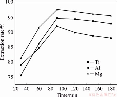 Fig. 6 Extraction rates of titanium, aluminum and magnesium at different roasting time