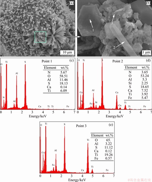 The morphology and component of the roasted product under the optimum conditions were presented in Fig. 7. Figure 7 shows that the roasted sample under optimal conditions was composed of a large amount of porous needle-like crystals which were very irregular. Combined with the EDS analysis, it could be determined that the needle-like particles were NH4Al(SO4)2, CaSO4, TiOSO4 (Points 1 and 3) and a trace of (NH4)3Fe(SO4)3, NH4Fe(SO4)2 and SiO2 (Point 2), indicating that AS greatly promoted the conversion of valuable metals titanium, aluminum and magnesium in TBBF slag to form metal sulfates, which was consistent with the XRD patterns of the roasted sample in Fig. 4(c).