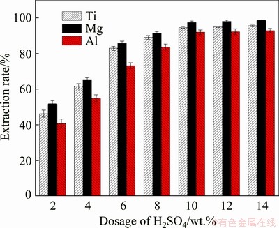 Fig. 8 Extraction rates of titanium, aluminum and magnesium at different dosages of H2SO4