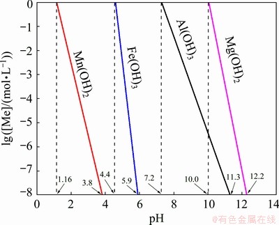 Fig. 9 lg[Me]-pH diagram of Me(OH)n solubility at 25 °C