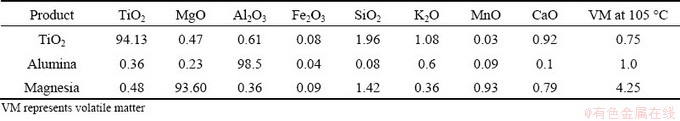 Owing to the large difference in hydrolysis pH values of Ti, Mg and Al, selective precipitation for the recovery of Ti, Mg and Al was possible. The formation of titanium-rich product could be achieved by recrystallizing of acid leaching solution in the boiling state (pH≤1), which could remove most of impurities with similar solubility to titanium (such as Fe and Mg). The precipitate was washed alternately with 2 wt.%, 40 °C H2SO4 solution and distilled water to obtain titanium-rich product. Table 2 displays that the chemical compositions of the three products rich in titanium, magnesium and aluminum. The mass fractions of TiO2 and volatile matter were 94.13% and 0.75%, and the whiteness was 95.14, which accorded with the national standard of A2 type TiO2 pigment (Chinese standard, GB 1706—2006).