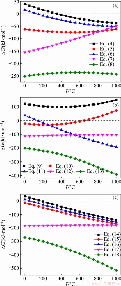 The reactions of the above five sulfates with MgAl2O4 and thermodynamic diagrams are shown in Eqs. (9)-(13) and Fig. 10(b), respectively. It could be seen from Fig. 9(b) that the reaction of AS with MgAl2O4 was not spontaneous. However, the other four intermediates produced by AS could spontaneously digest the TBBF slag at 370 °C, which would be accelerated to sulfate under the influence of SO2 and SO3. For the reaction of CaMg(SiO3)2 (Eqs. (14)-(18)) and Fig. 10(c), the five sulfates could react spontaneously under optimal roasting temperatures. In addition, thermodynamic calculation with HSC 6.0 software indicates that Reaction (15) (ΔG=-60.57 kJ/mol) is easier than Reaction (5) (ΔG=-22.91 kJ/mol) and Reaction (11) (ΔG=-52.36 kJ/mol) at 370 °C, which explains why the extraction rate of magnesium is always higher than that of titanium and aluminum, as shown in Figs. 4(a), 5(a) and 6, respectively.