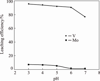 Fig. 1 Effect of pH on V and Mo leaching efficiencies (time 2 h, temperature 27 °C, PD 20%, stoichiometric acetic acid against V)
