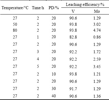 Table 2 shows the effects of time, temperature and PD on leaching efficiencies of V and Mo. Considering temperature effect on the V leaching efficiency, it was observed that, V leaching efficiency increased marginally from 90.6% to 93.8% by increasing leaching temperature from 27 to 80 °C, whereas Mo loss increased from 1.29% to 4.74%. Considering the fact that, any amount of Mo leached will increase impurity in V leach solution coupled with operational simplicity and energy efficiency, it was concluded that operating the leaching process at room temperature (27±1) °C is the ideal option. The effect of leaching time of 1-5 h on the V recovery and Mo loss showed that leaching efficiency of V was 82.8% at 1 h, and it increased up to 90.6% at 2 h. Further increase in reaction time up to 5 h resulted in insignificant increase in V leaching efficiency up to 92.2% along with increased Mo loss from 0.86% to 3.45%. PD is an important parameter in the leaching process that has significant impact on process economy. Results presented in Table 2 show that there is hardly any significant difference in leaching efficiencies of V and Mo within a PD range of 20%-40% keeping other parameters constant.