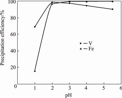 Fig. 2 Effect of pH on precipitation efficiency of iron vanadate (Fe/V molar ratio 1:1, temperature 50 °C, time 3 h)