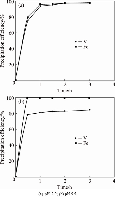 Fig. 3 Effect of time on precipitation of iron vanadate at Fe/V molar ratio of 1:1, 50 °C and different pH