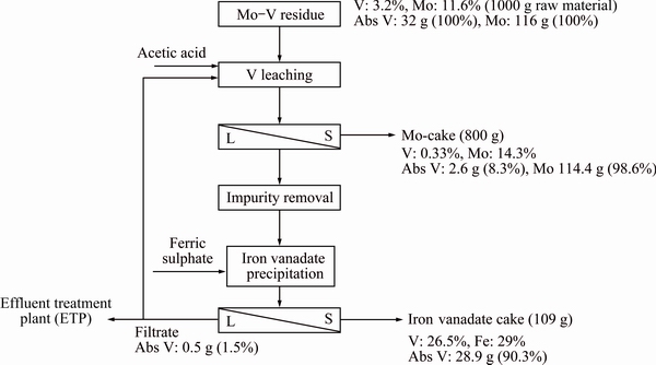 Hence, the objective of the present study is to develop an economical and commercially viable process to treat a Ca-rich Mo-V residue to make both the products saleable. In the first step, attempts were made to treat such a material by selectively separating the V value to the aqueous phase and transforming the residual Mo cake to a saleable product. In the second step, the V-rich leach liquor was treated to synthesize iron vanadate for its further utilization in the making of ferrovanadium [10]. In the present study, acetic acid and ferric sulphate were used for selective V leaching and to synthesize iron vanadate, respectively. Different process parameters such as pH, temperature, time, pulp density (PD) and reagent concentration were studied for selective V leaching and iron vanadate precipitation. Product quality with respect to impurities, V content, process feasibility and applicability for ferrovanadium making were discussed. The whole process was piloted in 1 kg scale and finally, a flow sheet of the complete process along with material balance was presented.