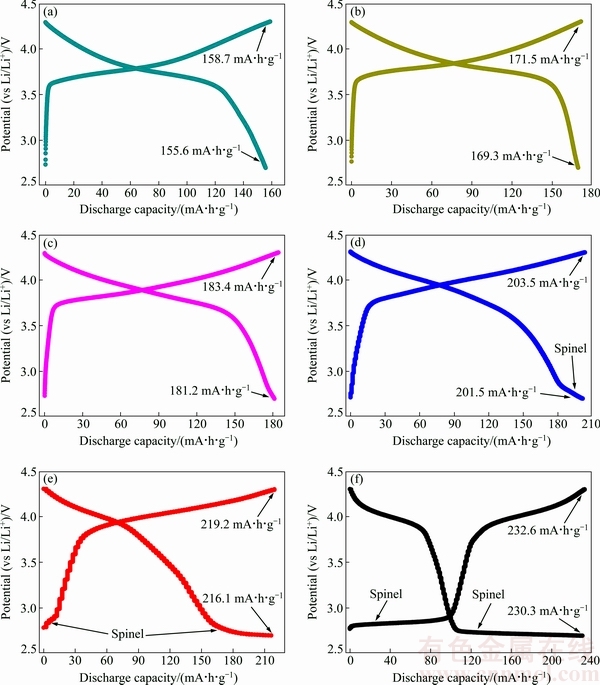图3所示为材料在2.7~4.3 V、0.1C下的首次充/放电曲线。由图3可发现,随着材料中尖晶石相的增多,材料的充/放电曲线呈现出较大差异。当x=0、0.1、0.2时,材料的充/放电曲线基本相同,但当x值继续增加(x=0.3、0.4、0.5),就可以在2.7 V左右明显地观察到Mn4+/3+尖晶石相特征充/放电平台(见图3中黄色箭头标记)[20-21]。随着x值的增大,材料在0.1C下的首次充放电比容量也逐渐增大,其原因可归结于复合材料中的尖晶石相逐渐增多,该成分具有电化学活性,能参与到充放电过程中,并且尖晶石相中的Mn附近发生的Mn4+