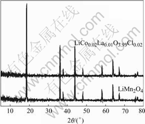 Fig.1 XRD patterns of LiMn2O4 and LiCo0.02La0.01Mn1.97- O3.98Cl0.02 powders