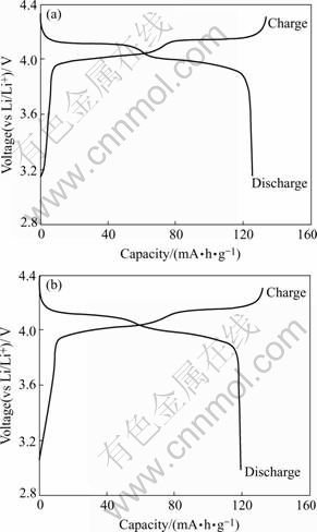Fig.3 First charge-discharge curves of Li/LiMn2O4(a) and Li/LiCo0.02La0.01Mn1.97O3.98Cl0.02(b) cells