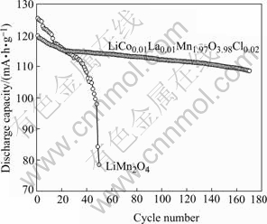Fig.3 shows the first charge-discharge curves of LiMn2O4 and LiCo0.02La0.01Mn1.97O3.98Cl0.02 cathodes. It can be obviously seen that the charge-discharge curves of the two samples have two voltage plateaus at approximately 4.05 and 4.15 V, which is a remarkable characteristic of well-defined LiMn2O4 spinel. From charge-discharge curves, it is found that lithium ion is reversibly lithiated/delithiated through LiMn2O4 spinel framework. The initial capacity of LiMn2O4 obtained in this work is 125.9 mA·h/g (theoretical capacity of LiMn2O4 is 148 mA·h/g). By doping with Co, La and Cl, the initial capacity decreased to 119.9 mA·h/g. This is due to Co, La substations for Mn to decrease of Mn3+ amount in the substituted spinel phase since during the intercalation/deintercalation of Li+ in the LiMn2O4 matrix only the amount of Mn3+ contributes to the charge/discharge capacity.