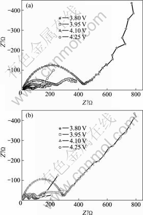 Fig.5 Nyquist plots recorded for Li/LiMn2O4(a) and Li/ LiCo0.02La0.01Mn1.97O3.98Cl0.02(b) system at different charging voltages